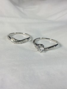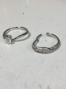 エンゲージリング、マリッジリング共に下部をニッパーで切断 し、リングを外す際に広げて変形し破損している状態。