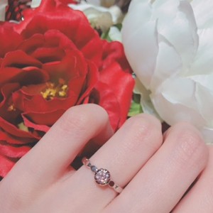 センターダイヤを左右の腕で包みこみ、両サイドにピンクダイヤを配置した愛らしいデザインです。