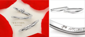 ⇒それぞれの指輪の内側にはご神紋の二葉葵が刻まれ、由緒正しいブライダルリングに仕上がりました。