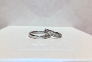 “自分がずっと着けていく指輪だから、着けたいものを”とそれぞれでお選びになったのですが、せっかくだからペア感がほしいなあ…とのお話になり、女性様の指輪に入っている、ミル打ちを男性様の指輪にも一筋センターの切り返し部分に追加するセミオーダーをご提案しました!