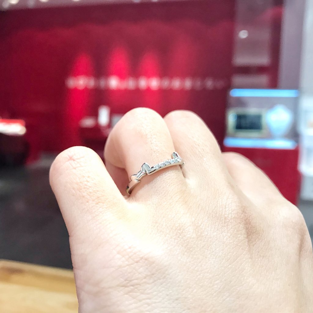 ▲ご結婚指輪は、小指側にも中指側にも猫耳が🐱2匹のネコの間には、ホワイトダイヤモンドが5石入っています。
