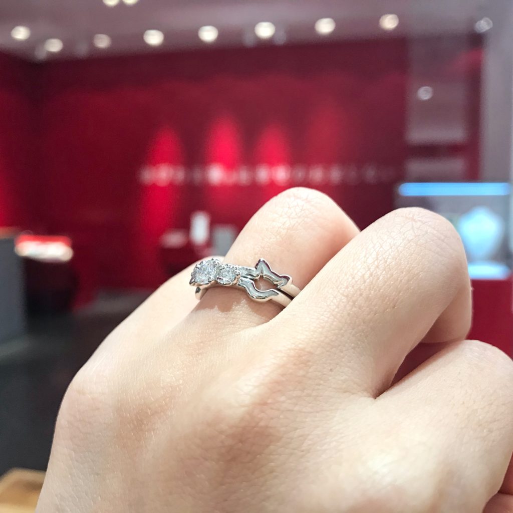 ▲ ご婚約指輪は、センターダイヤモンドの両サイドのダイヤモンドが、ネコの肉球留め!ディテールが心をくすぐります。