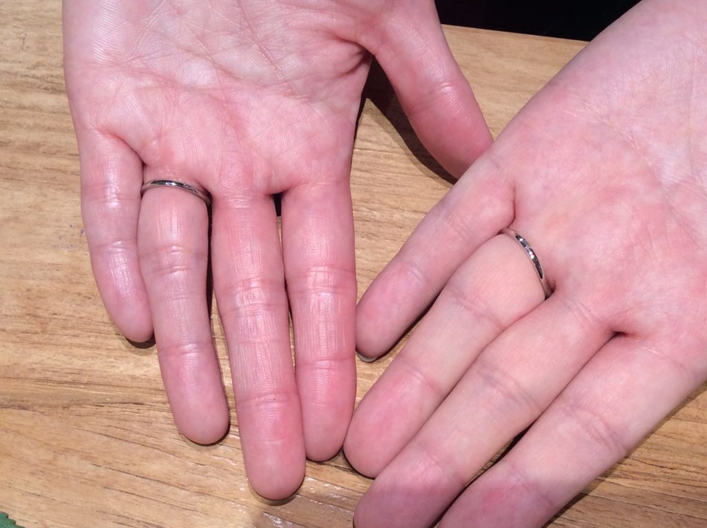 こちらのデザインをベースに、指に馴染むよう幅をおふたりのお好みに合わせ、かつ手のひら側に猫の彫りを入れていただきました(=^・^=)