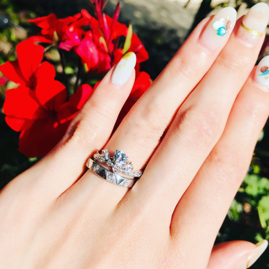 婚約指輪と結婚指輪でデザインは違いますが、きれいに重なっためずらしい組み合わせです😄とてもきれいに着けてくださっていました・・・♡