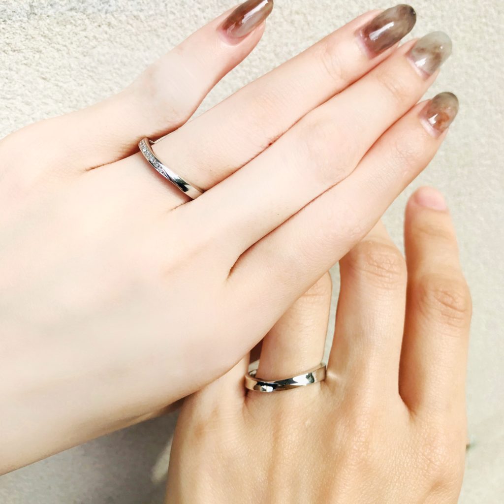 マリッジリングはシンプルですが、ダイヤモンドが程よく大きくアクセントになるように職人がこだわりの留め方をしています。