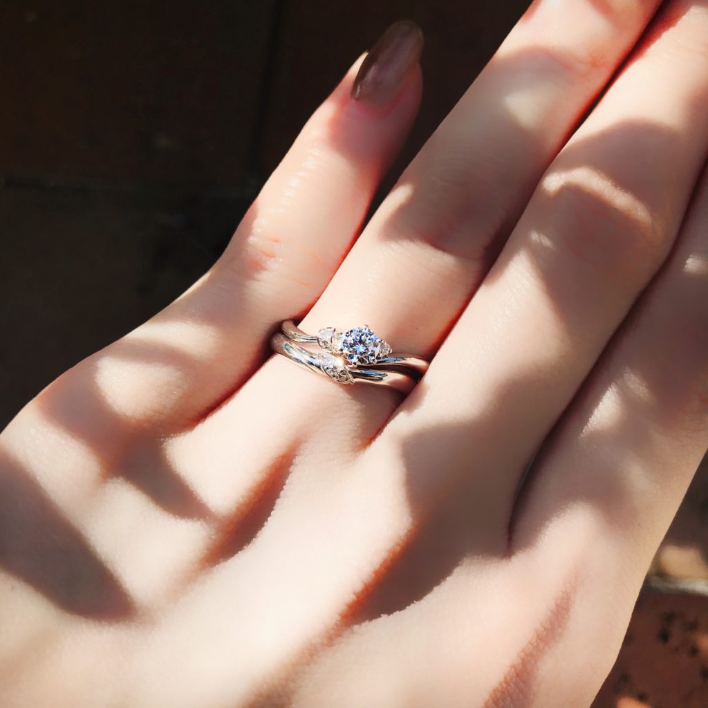 婚約指輪から結婚指輪へ優雅に流れるように留められたメレダイヤモンドが1つのリングのようにぴったりと重なりあうパーフェクトセットリングです💛