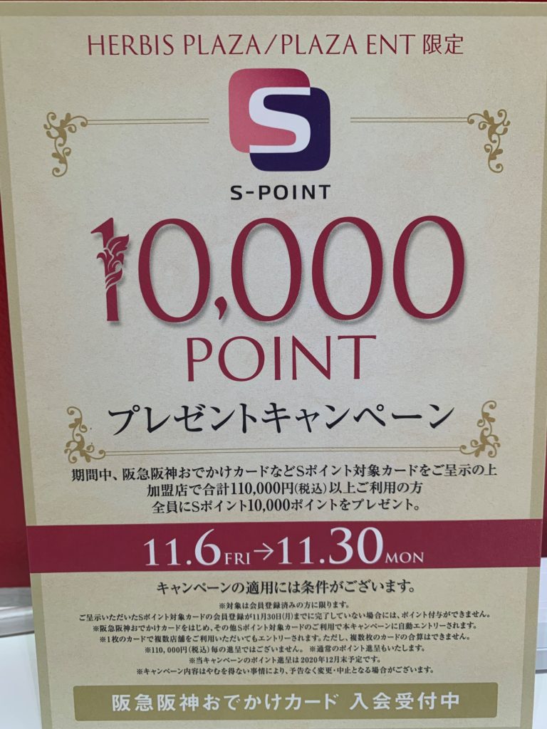 さて、本題ですがそんな阪急阪神系列の商業施設ですので、勿論「Sポイント」も付与されるのですが、なんと今日から11万以上ご購入のお客様に1万ポイントプレゼントが始まるそうです。