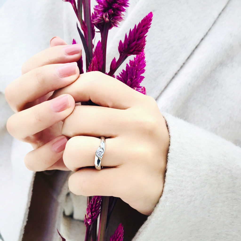 婚約指輪だけで着けても軟かな印象と、ダイヤモンドの輝きがより一層美しく見せる留め方は他には無い、魅力があります。