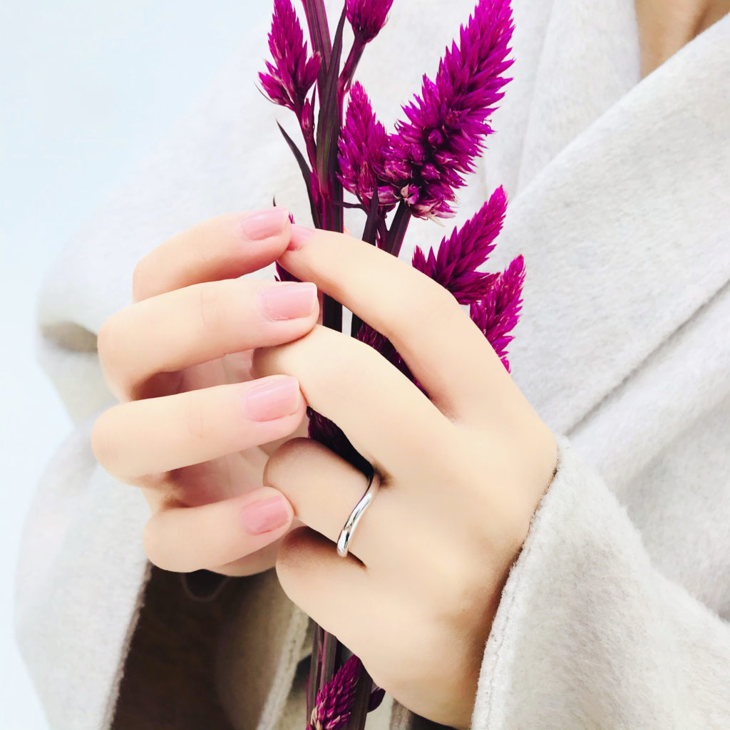 腕の丸みやウェーブラインにこだわった、視覚的、着け心地ともに優しいリングです。