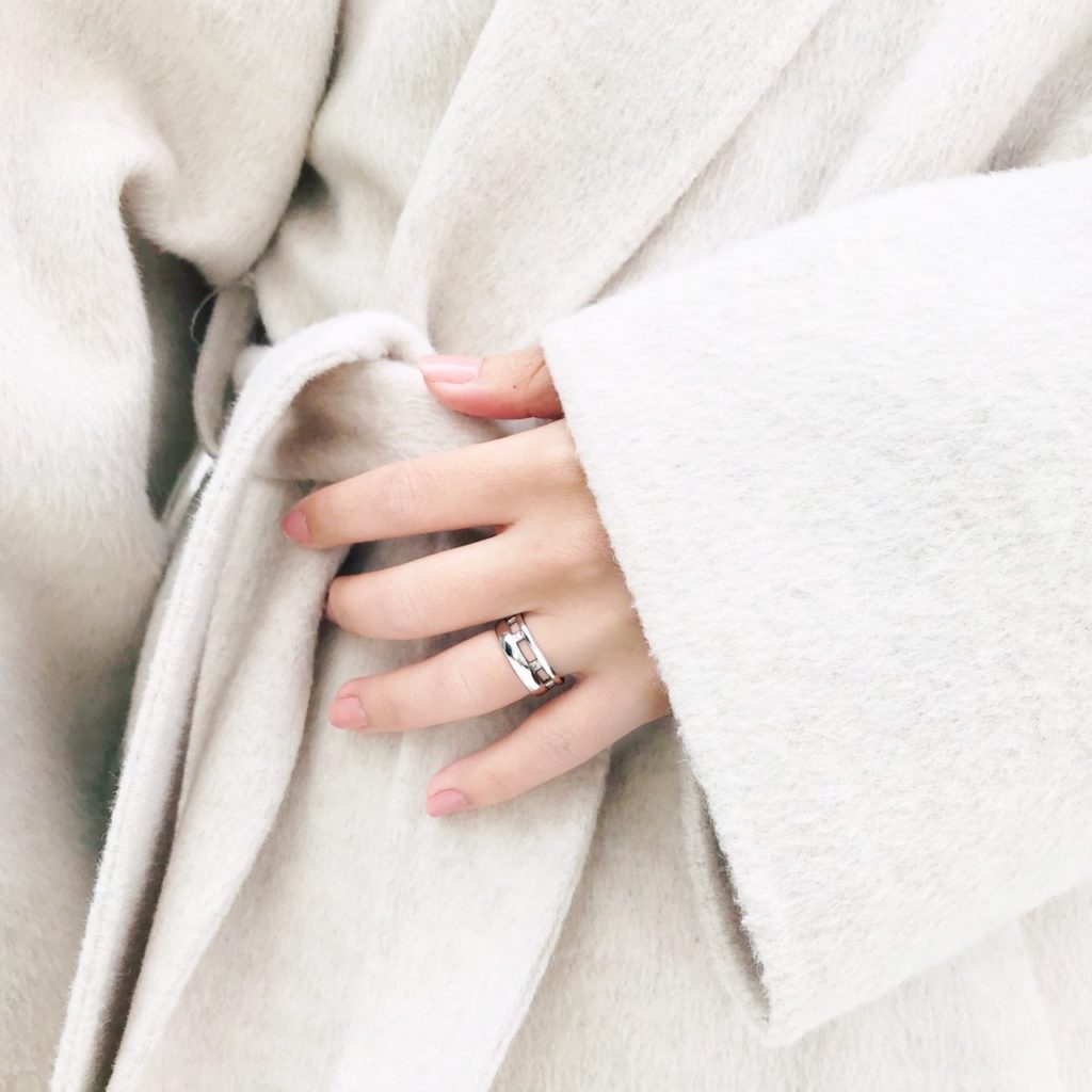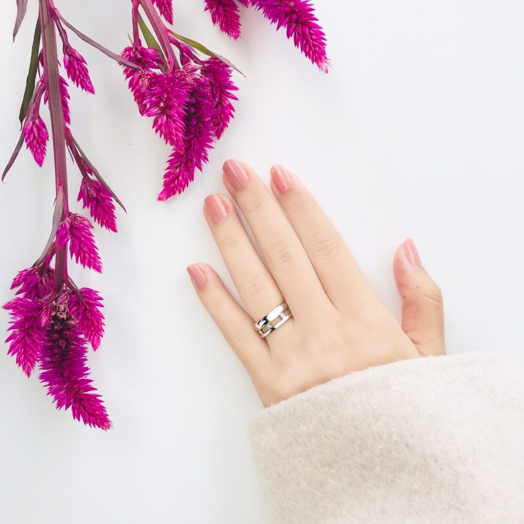 大小2本の甲丸リングが空間をあけ、スクエアなパーツでつながれたデザインです。しっかりとした幅広のリングですが、空間・丸みのある腕により軽い印象に仕上がっています。また、2本のリングをつなぐスクエアパーツがスタイリッシュに映ります。スクエアパーツにメレダイヤ(0.01ct×6)を配置し、華やかさをプラスしました。空間による軽さと指に通した時の重厚感のバランスが気持ちいいリングです。