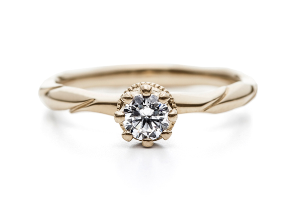 婚約指輪のセンターダイヤモンドは8本爪で、爪の付け根が細く、先端に向けて太くなるミルククラウンのような、特徴的な爪です。