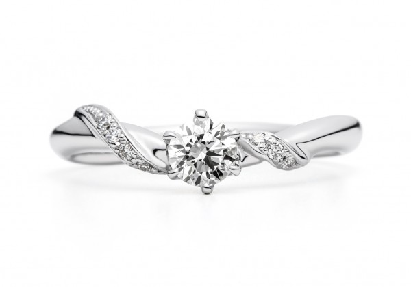 エンゲージメントリングは、緩やかなV字ラインと、流れるように巻き付いたメレダイヤモンドが美しく、程よい存在感と清涼感を感じます。