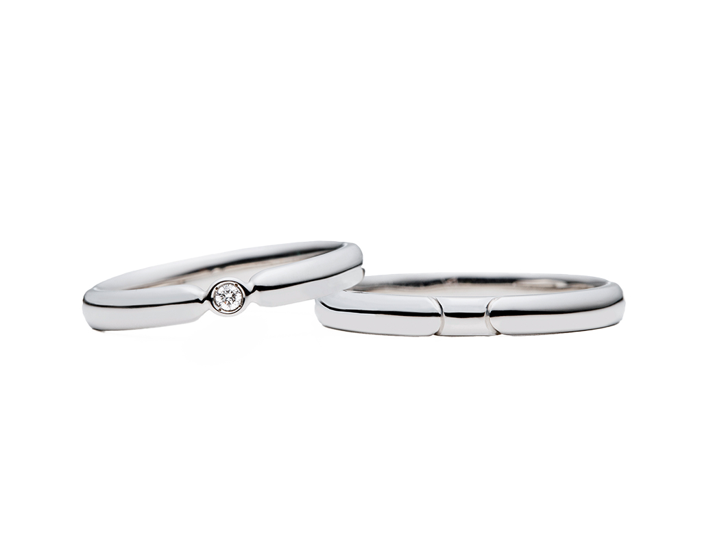 婚約指輪はどちらも、プラチナの光沢が美しい、丸みのあるストレート型です