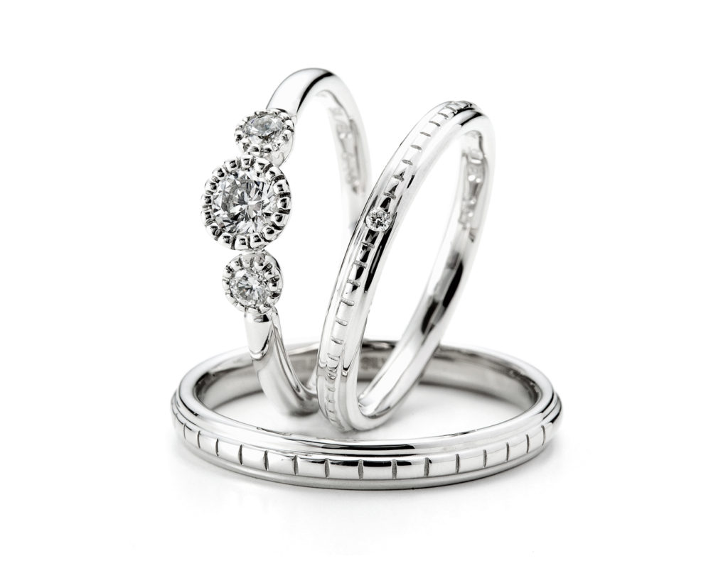 一体感のある輝きを放つように意識して、メレダイヤモンドの間隔を狭くして配置しています。