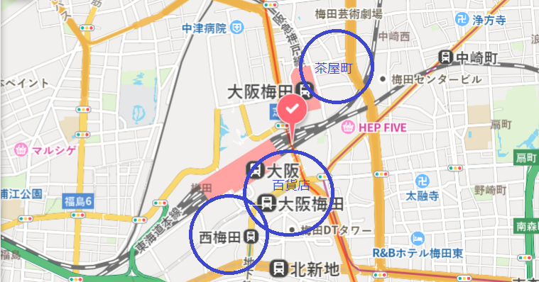 私の在籍している大阪・梅田本店の周囲には約200店舗ほどのお店があります。エリアに分けると、<茶屋町><百貨店><西梅田>の3つに大きく分けられます。