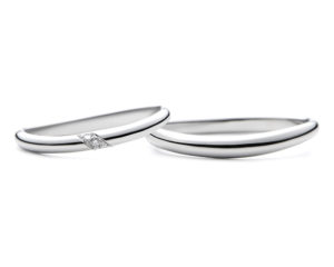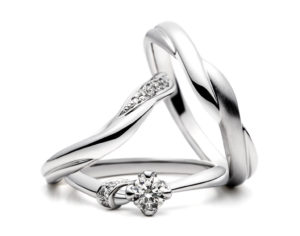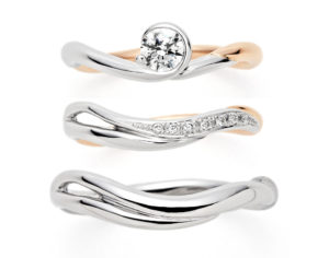 次のデザインは「MUSUBI~紡ぐ想い~」です。大切に紡がれた想いを表現するリングをコンセプトにデザインされた指輪で、マリッジリングの2本のウェーブラインは、ふたりの想いの交わりを表しています。