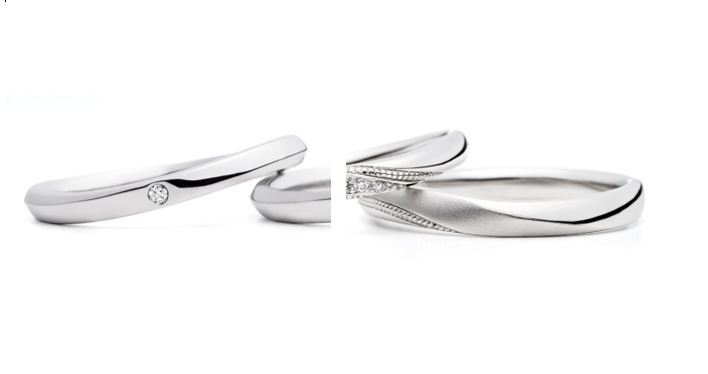【ペアではないこと】が当店でのおふたりの結論でした。そこから、おふたりは一度退店され、当日中に再来店、お互いがしっくりくる指輪を選ばれました。どちらも似たウエーブラインだったことからも、ご成約いただきました。