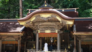 神職・巫女に先導され、新郎新婦と参列者全員が境内「細殿」へ歩きます。神前式の印象的なシーンとして思い浮かべる方も多いでしょう。