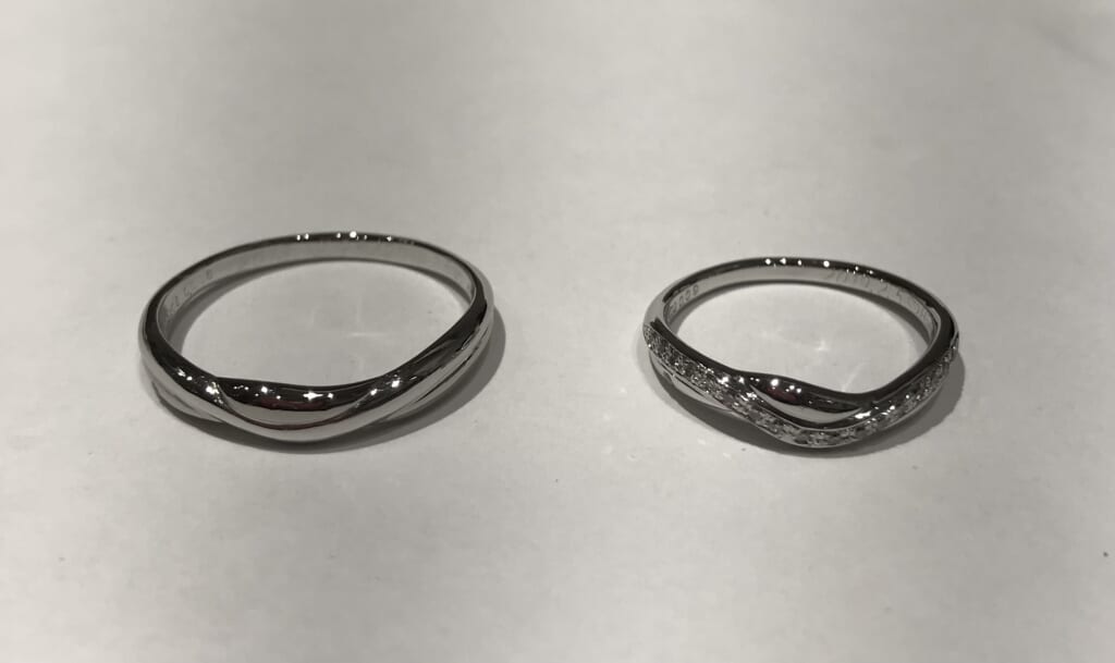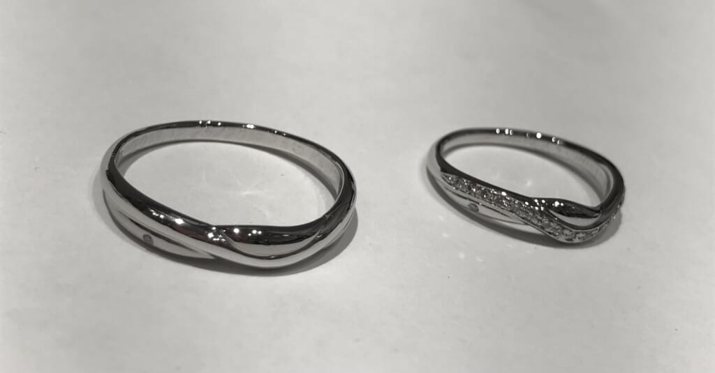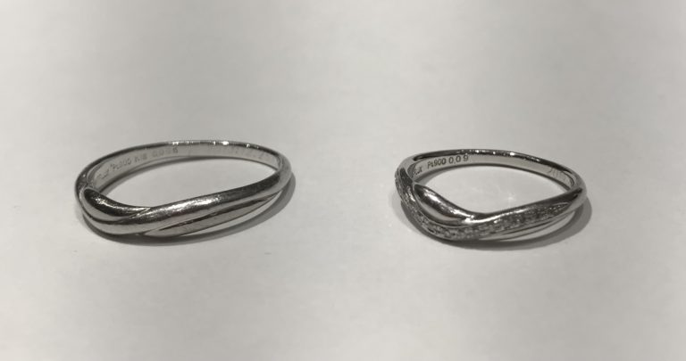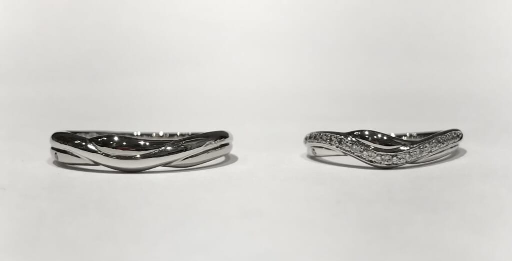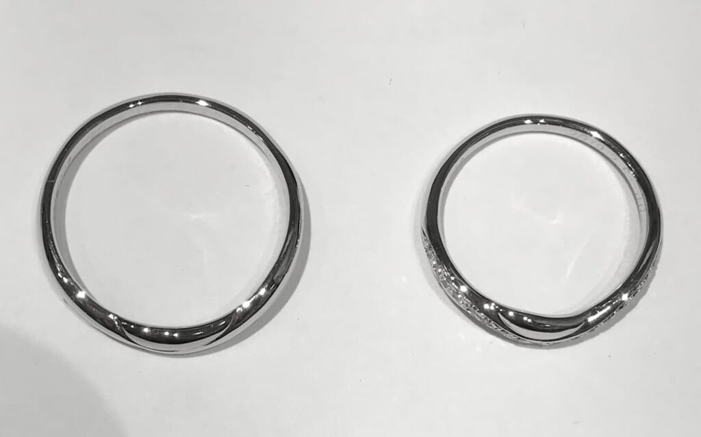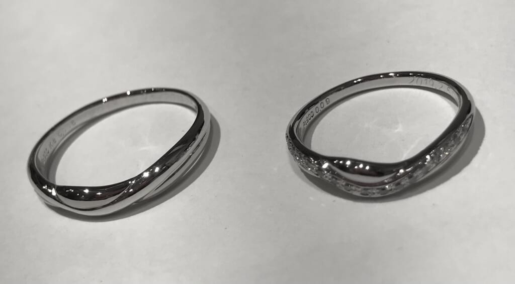 写真右のリングは真ん中のラインにメレダイヤモンドを追加したデザインです。