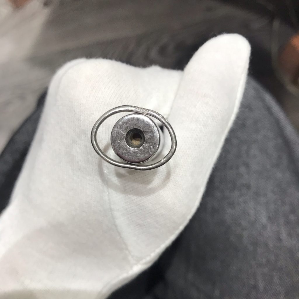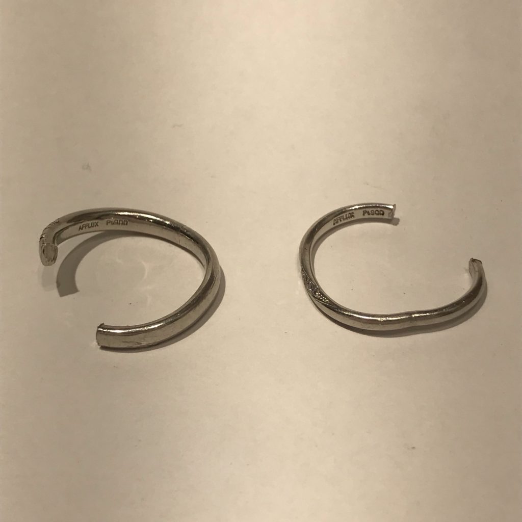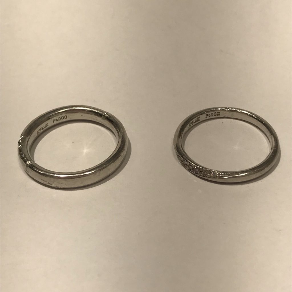 切断後、指から外すために大きく捻りながら開いたと思われます。特にメンズ(画像左)は切断の際についた深い傷も見られます。