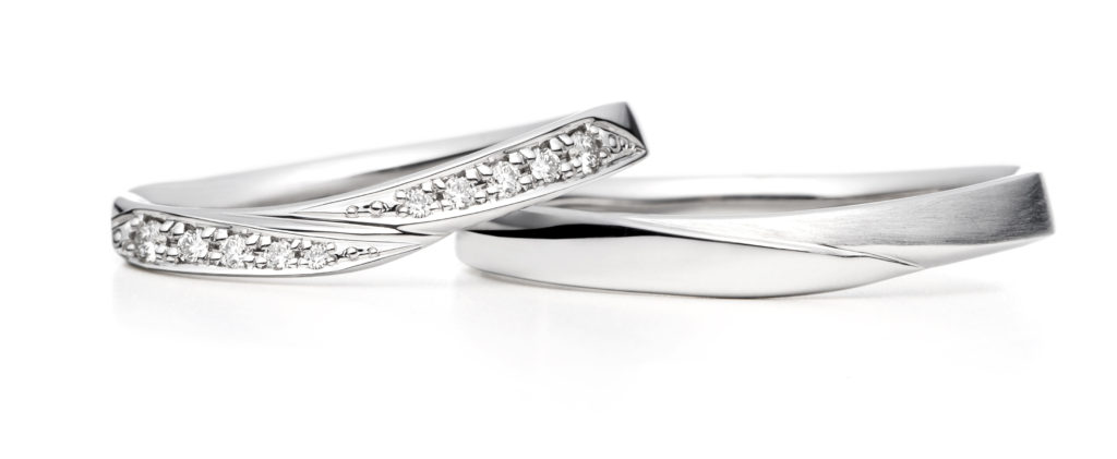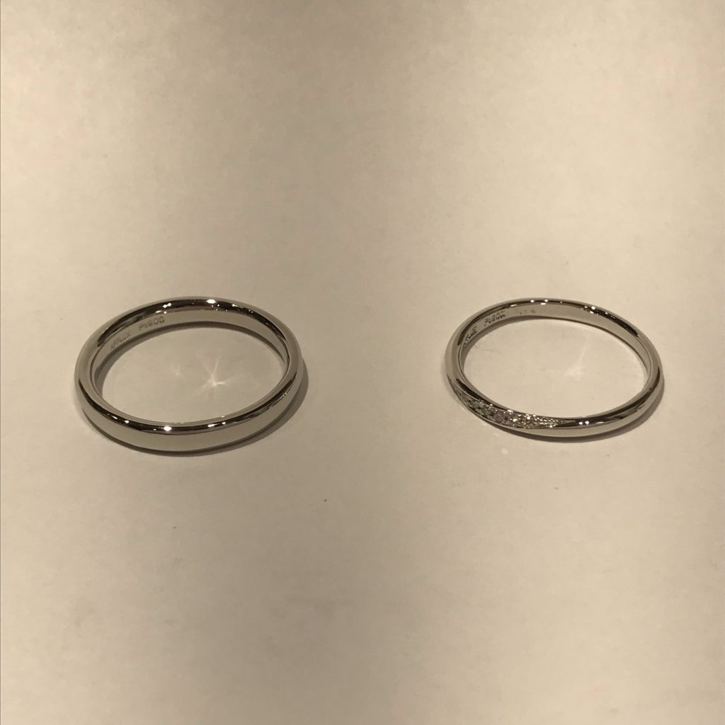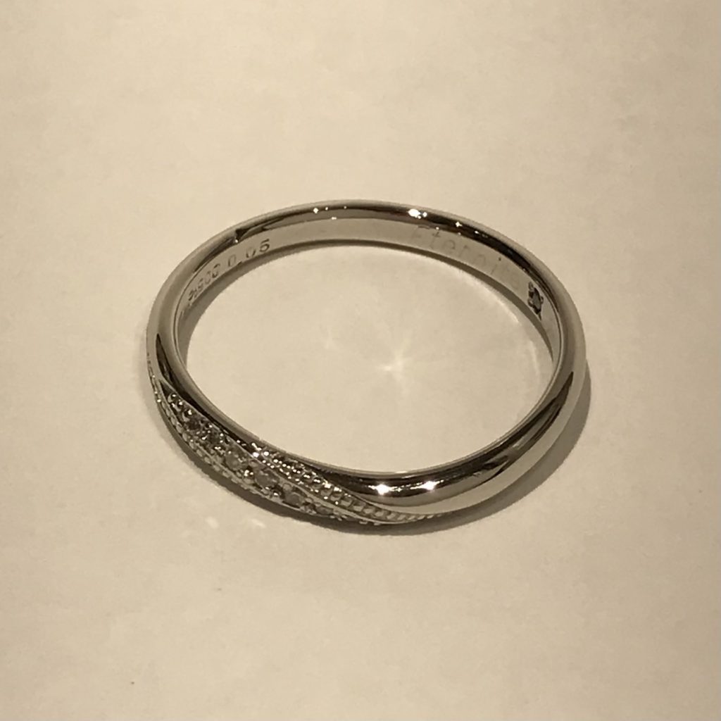 見事ピカピカ綺麗に復活!切断の際についた傷も綺麗に元通りにしました。レディースは開いた影響か、表に留まっていた石が1石揺れていたので留めを強化致しました。