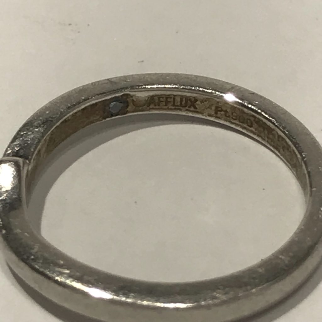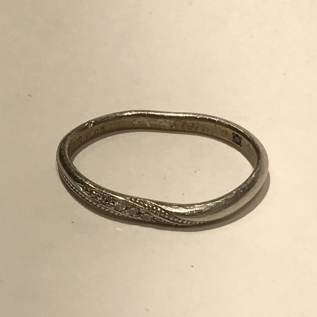 内側の縁に大きな傷があります。内側は変色しているように見えますが、汚れでございます。いつも着けてくださっていることが指輪の状態から伺えます。嬉しいですね。