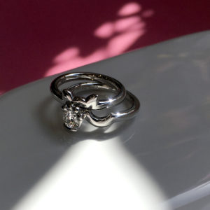 リングの側面から立ち上がるふわふわ感のある縁取りと、リング中央のファセットがマッチした存在感のあるデザインです。