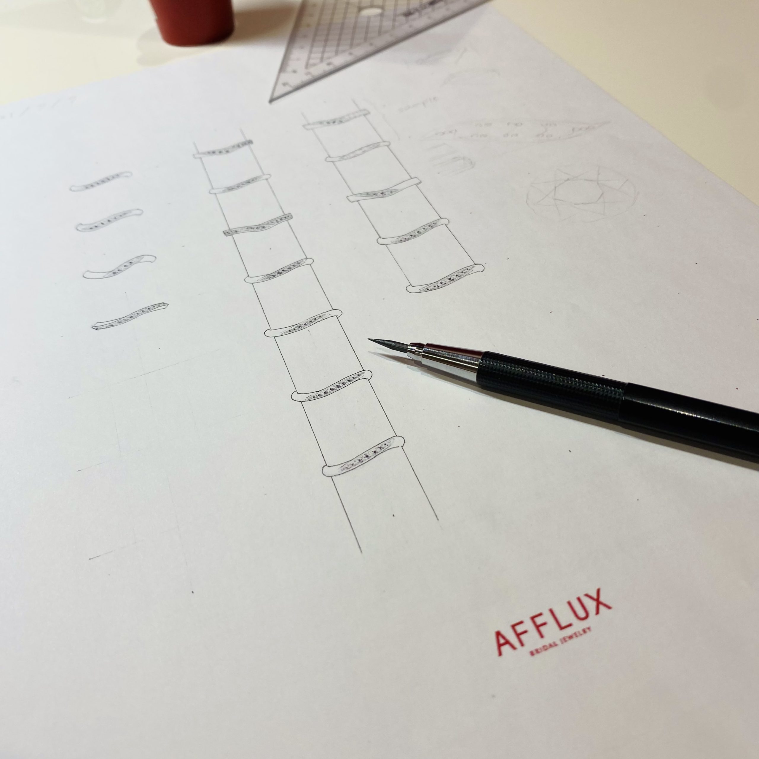 今週は”Relation”と”Clara”というデザインを、本物の指輪を見ながら描く練習をしました。