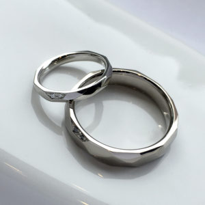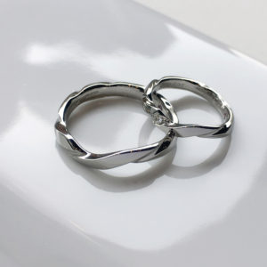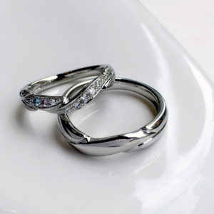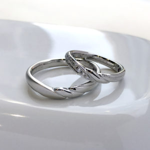 ミル打ちとメレダイヤが華やかなレディースと、ミル打ちは施さずデザインをトレースしたメンズのマリッジリングです。