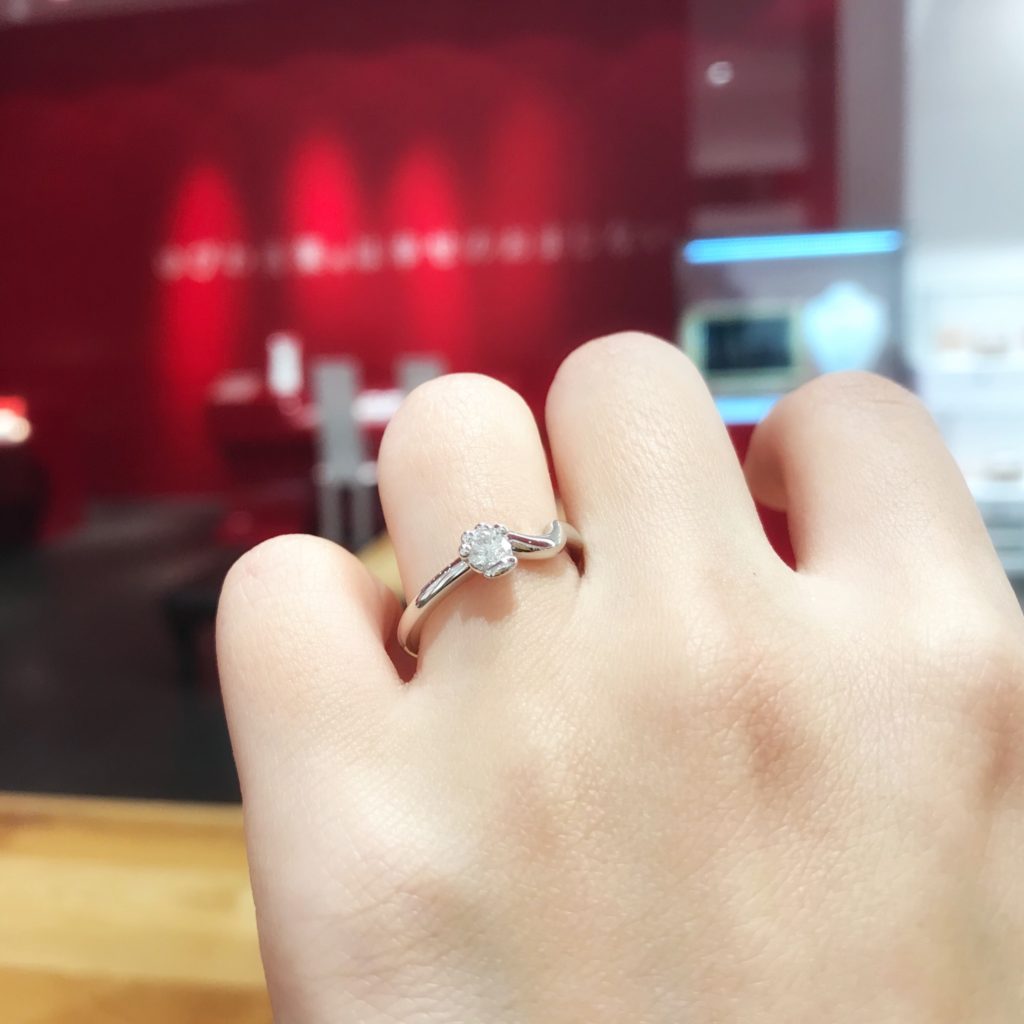 ▲ プロポーズ!とすぐにわかる一粒ダイヤモンドのリング。憧れ!ダイヤはネコの肉球留めで細部のこだわりが嬉しい