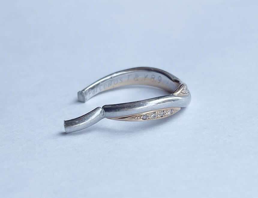 - 深い傷などがはいってしまった場合、その傷に合わせて加工をすると全体の厚みが大きく目減りしてしまい、指輪の耐久性に支障をきたします。支障をきたすと判断した場合、一部傷を残して加工する場合がございます。