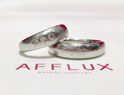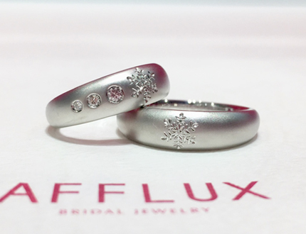 5年前にご購入。日常の着用で、少しずつ表面が摩耗し雪の結晶の手彫りがなくなってきた為お修理。レディース、メンズ共に雪の結晶の彫りを入れ直しし、仕上げ直しをしお返ししました。(サンドブラスト仕上げ)