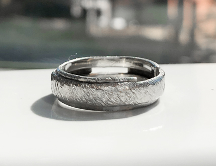 サイズが少し大きくなってしまったが、そのまま着用していて落としてしまい、アスファルトに強く擦ってしまった為お修理。指輪の変形(歪み直し)と表面の傷とりを行いました。