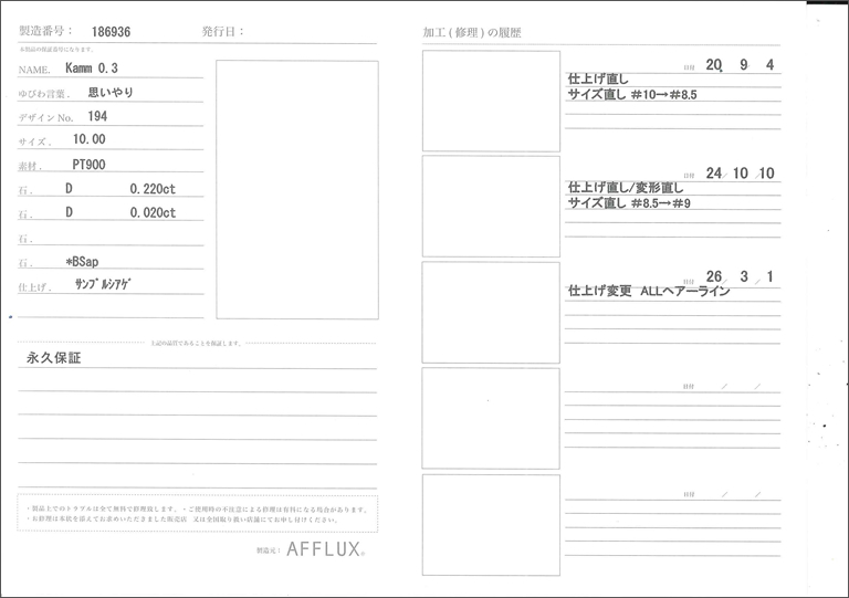 - AFFLUXのジュエリーは「1オーナー制」を基本に、AFFLUXの永久保証®を対象としております。所有者が変わった場合や、ご購入時にご登録頂いたお名前と照合出来ない場合はお受け致しかねます。お客様ご自身で過去の修理履歴が把握出来ず、極端なサイズへのお直しなどでジュエリー自体に大きな負担をかけてしまい、その後の使用に影響が出てくる可能性が大きいからです。