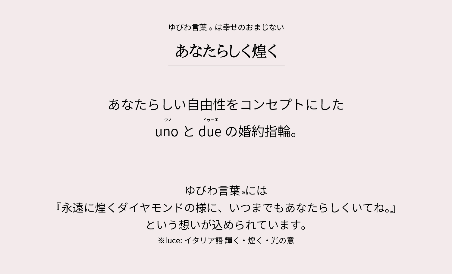 婚約指輪専用のデザインでuno (ウノ)とdue (ドゥーエ)の2型あります。ゆびわ言葉®に込めた想いを50種類以上の組み合わせからなる自由性の高い造りで表現できることが最大の特徴です。どちらもセンターダイヤモンドのセッティングは6本爪です。石座はキューレット(底)が見えるように美しいサイドデザインで造りこまれており、ダイヤモンドのまばゆい煌きを感じられます。石座は独立した造りの為、石座のみまたは腕のみの素材変更など自由自在に組み合わせを楽しんで自分らしいオリジナリティを追及して頂けます。