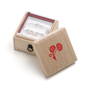 AuhiとIKAZUCHI限定で、ご購入頂いた方には、二葉葵があしらわれた特製の桐箱リングケースに入れてご納品致します。3本が収納できる桐箱は、ご両家が揃う結納や顔合わせなどにぴったりです。挙式前からの大切なイベントで活躍してください。