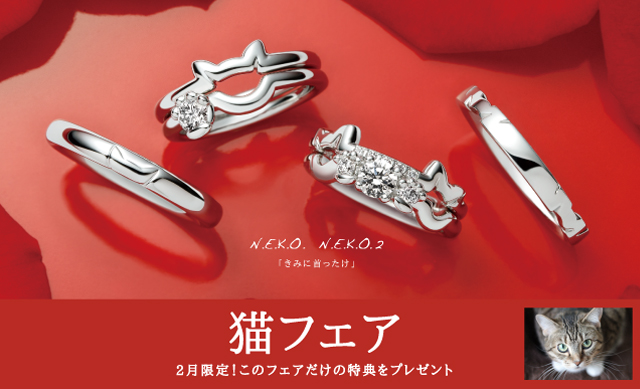 【2月だけの特典】猫フェアを開催 猫フェア期間中、ご成約頂いた方には2月限定の“成約特典”をご用意しています。是非このお得な期間にAFFLUXの指輪をご試着しにご来店下さいませ。 ※直営店とAFFLUX取扱店では、フェア期間と成約特典が異なります。