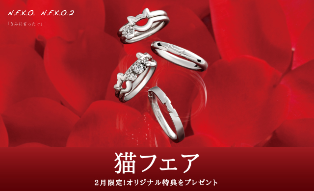 猫(N.E.K.O.)フェアを開催 猫フェア期間中、ご成約頂いた方には期間限定“成約特典”をご用意しています。是非この機会にAFFLUXの指輪をご試着しにご来店下さいませ。 ※直営店とAFFLUX取扱店では、フェア期間と成約特典が異なります。