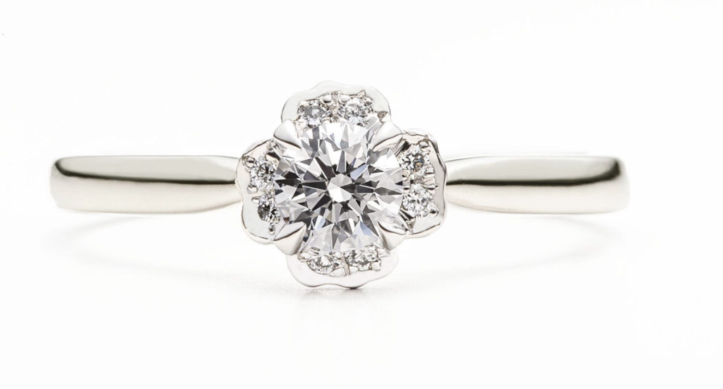 スターチスの顎(がく)の愛らしさと輝きを大きく魅せる取り巻きのダイヤモンドの留め方がこだわり。着けたご本人からよく見えるリング側面には透かし模様があるのでデザイン性が際立つシンプルな婚約指輪の要素も取り込んだ。結婚指輪との重ね着けもぴったりと合う。