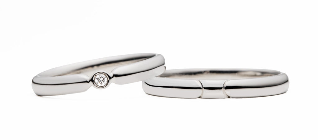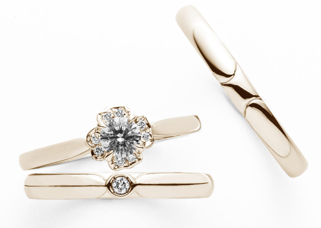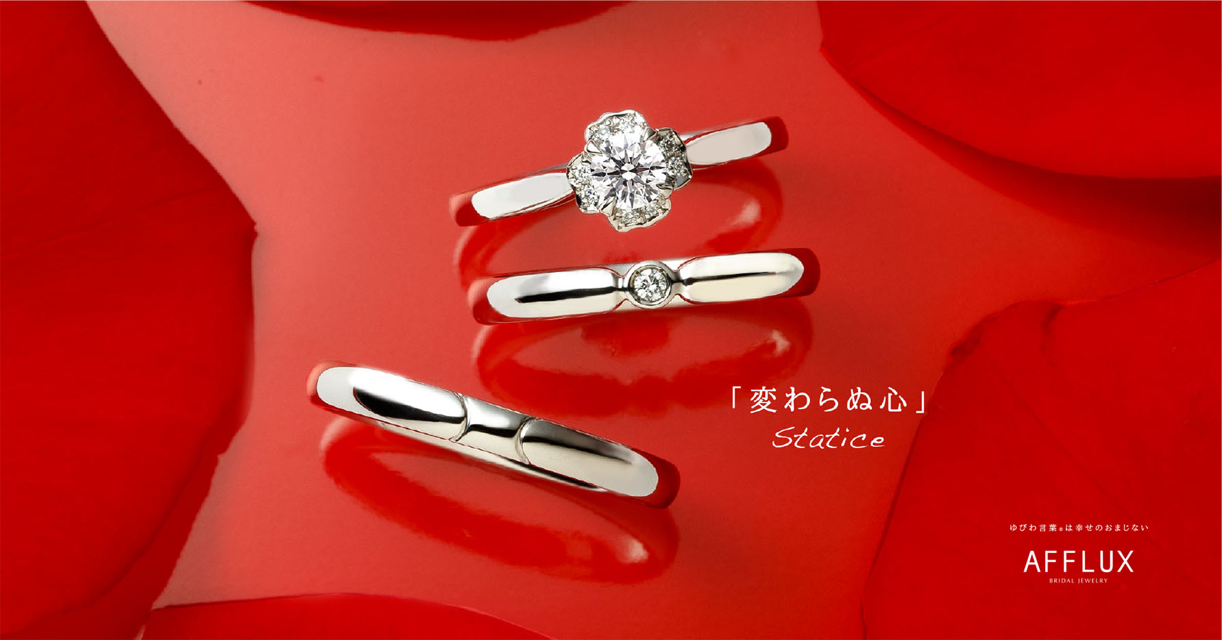レディースリングは1石のダイヤモンドがとにかく綺麗に際立つリングであること。このデザインで、唯一無二、『変わらない心』を表現している。丸いフォルムと1石のダイナミックな輝きはシンプル美が追求した。 メンズリングはスターチスの顎を支える太い茎をイメージ。「結婚指輪はシンプルで毎日の着けやすさを考慮したデザイン」とデザイン発案者は語る。ターチスはピンク:永久不変、イエロー:愛の喜び・誠実など)と花の色によって、込められた想いが変わるため、素材変更のオーダーでふたりだけの結婚指輪を造り上げるのも面白い。