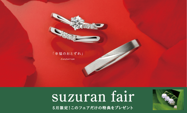 【5月だけの特典】suzuran fairを開催 suzuran fair期間中、ご成約頂いた方には5月限定の“成約特典”をご用意しています。是非このお得な期間にAFFLUXの指輪をご試着しにご来店下さいませ。 ※直営店とAFFLUX取扱店では、フェア期間と成約特典が異なります。