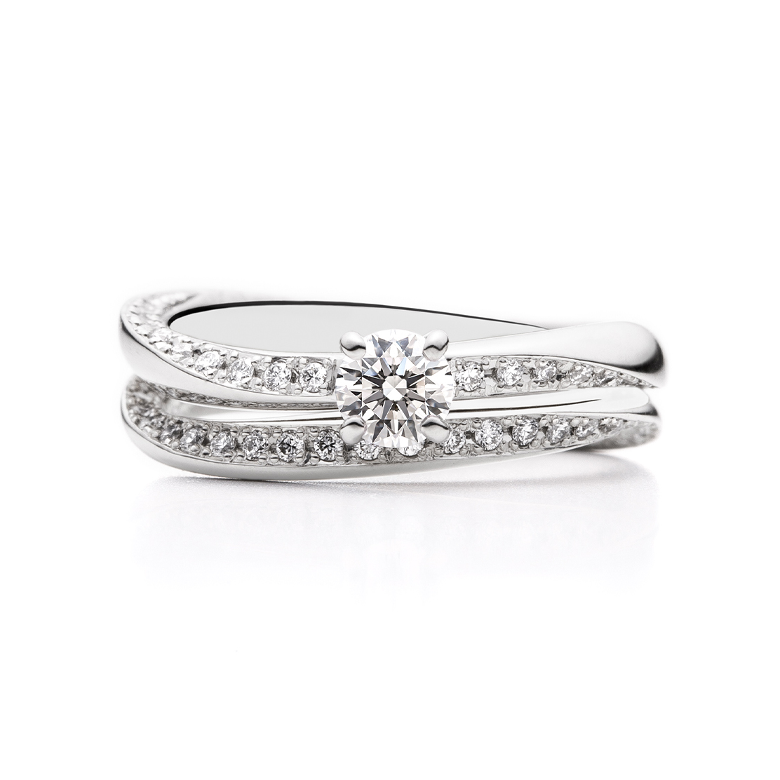 - 婚約指輪:センターダイヤモンドは4本爪です。石枠は2段腰のスタイルです。センターダイヤモンドに対し石枠がすっきり見えます。腕は細身で緩やかなウェーブを描きます。メレダイヤモンド(0.005ct×20)がデザイン左右の側面から右下の側面まで回りこむエタニティタイプのデザインです。(※サイズにより個数が変化します)細く繊細なダイヤの流れがエレガントな輝きを放ちます。