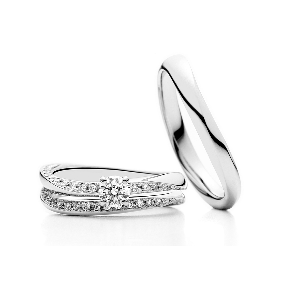 結婚指輪(下):緩やかなウェーブの細身タイプでウェーブの間隔が広いので、着用時にはストレートのような印象です。婚約指輪と同様にメレダイヤモンド(0.005ct×27)(※サイズにより個数が変化します)を贅沢に並べたデザインです。左上の側面から右下の側面までメレダイヤモンドが回りこみます。結婚指輪(ダイヤあり)は側面から指輪内側まで傾斜をとり、より強く巻き込んでいます。