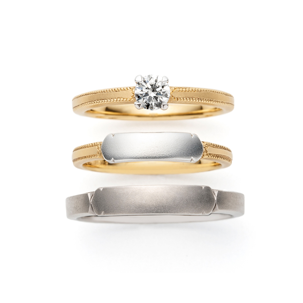 結婚指輪(中央):プラチナとK18イエローゴールドのコンビタイプで正面には模様を刻むことができるアンティークプレートをイメージしています。