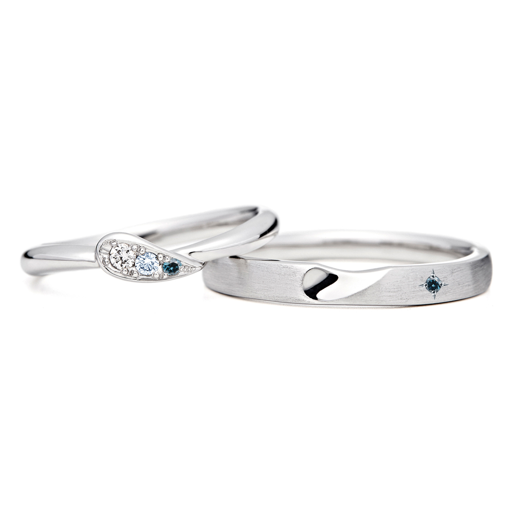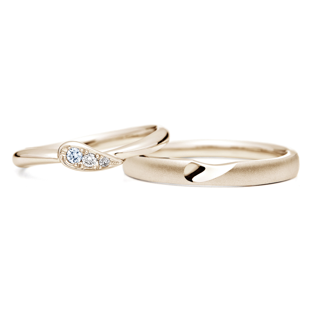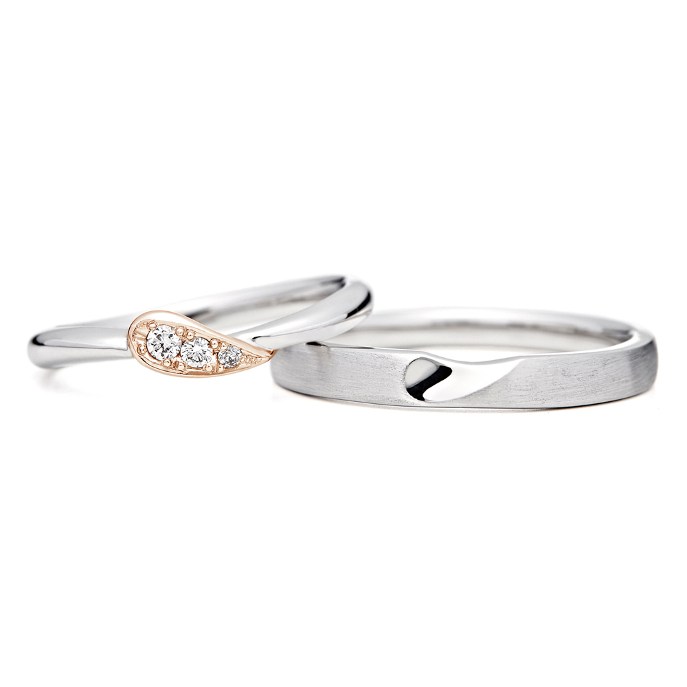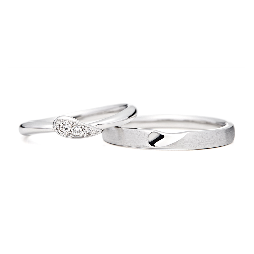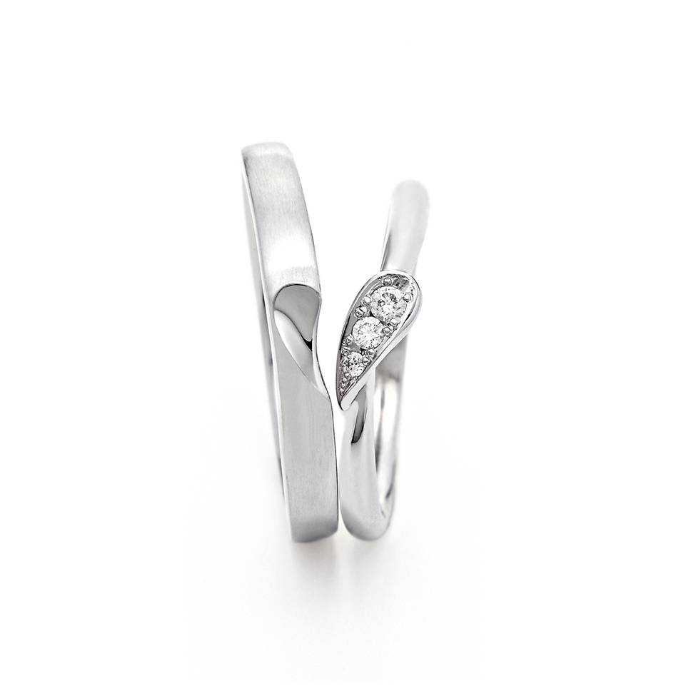 - 左:細身のウェーブラインです。正面のパーツにダイヤ(0.03ct×1,0.02ct×1,0.01ct×1)が彫留めにて彫留めにて配置されています。婚約指輪と重ねるとセンターダイヤモンドを支えるように大きなハートの形が表れます。