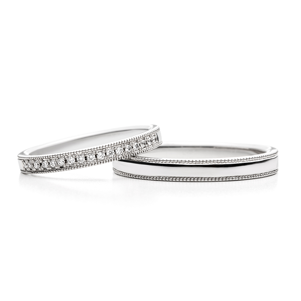 - 幅違いのストレートラインです。婚約指輪と同様にミル打ちで囲んだデザインです。(サイズ直し部分を除く)