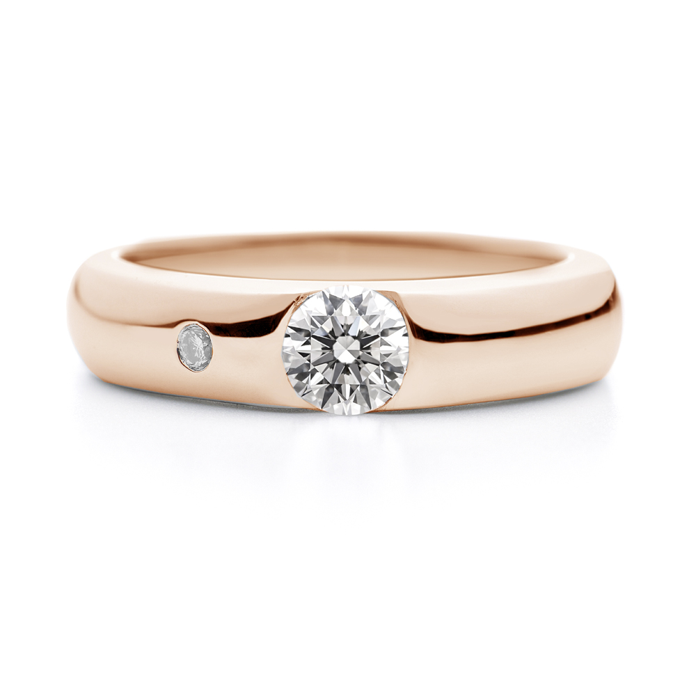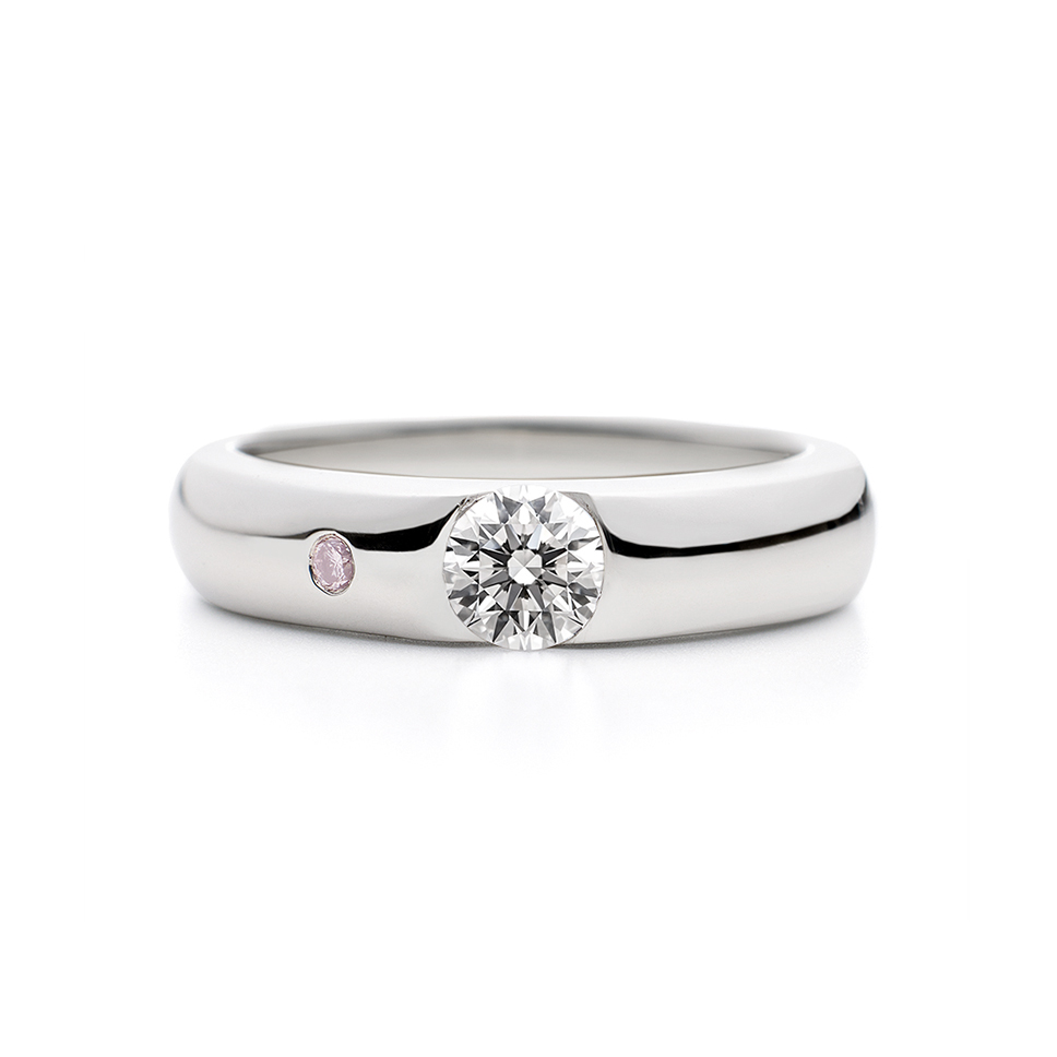 伏せ込みタイプで丸みを損なわない留め方をしています。センターダイヤモンドの脇にピンクダイヤモンド(0.02ct×1)を可愛らしく留めています。