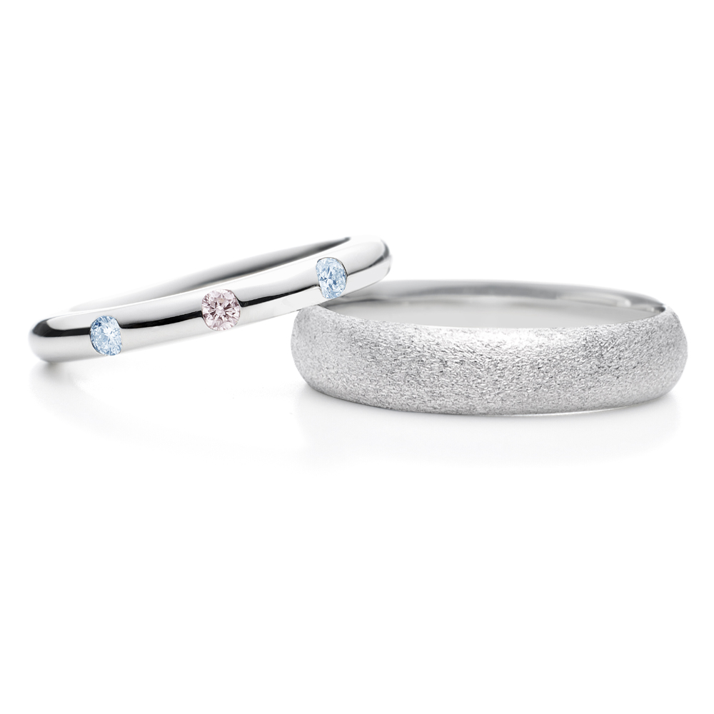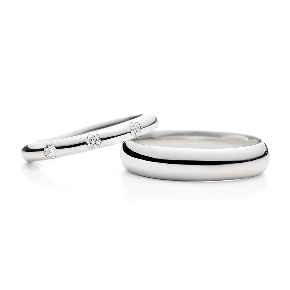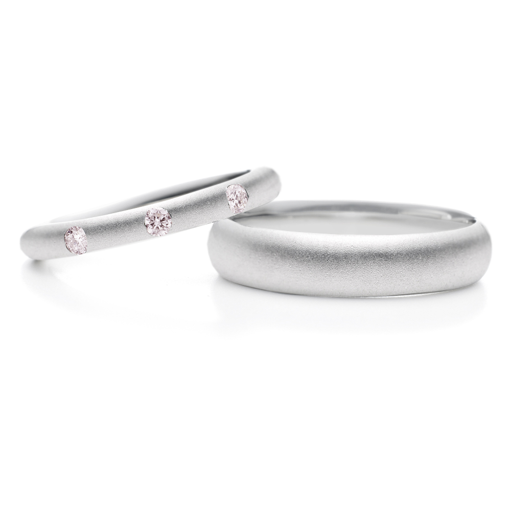 - 左:正面に大きめのメレダイヤモンド(0.04ct×3)を等間隔に指輪の幅いっぱいに留めて贅沢な輝きを与えています。