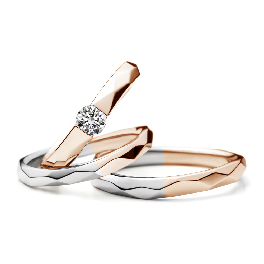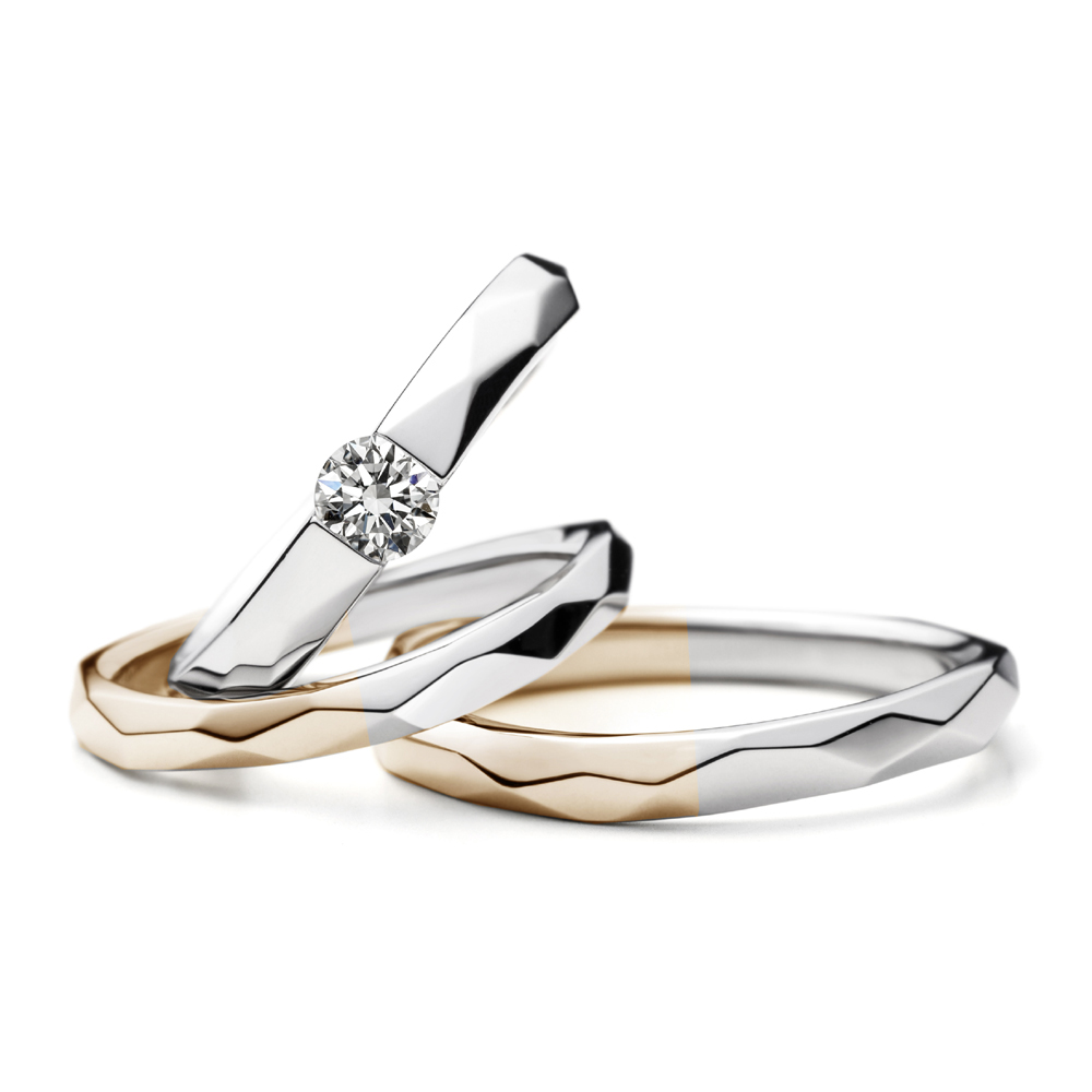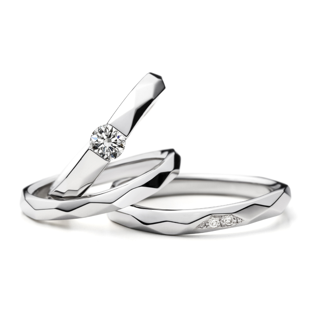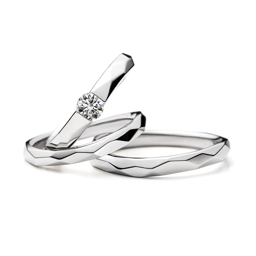- 婚約指輪:センターダイヤモンドのセッティングは爪の無い左右からの伏せ込み留めです。引っかかりの無いタイプで日常使いにも適したファッショナブルなデザインです。緩やかなS字のウェーブによって表面の硬質なイメージに優しさを感じさせます。表面のランダムなファセット面は煌めく水晶の様な印象を与え、センターダイヤモンドの輝きをより引き立たせるシンプルながら存在感のあるデザインです。