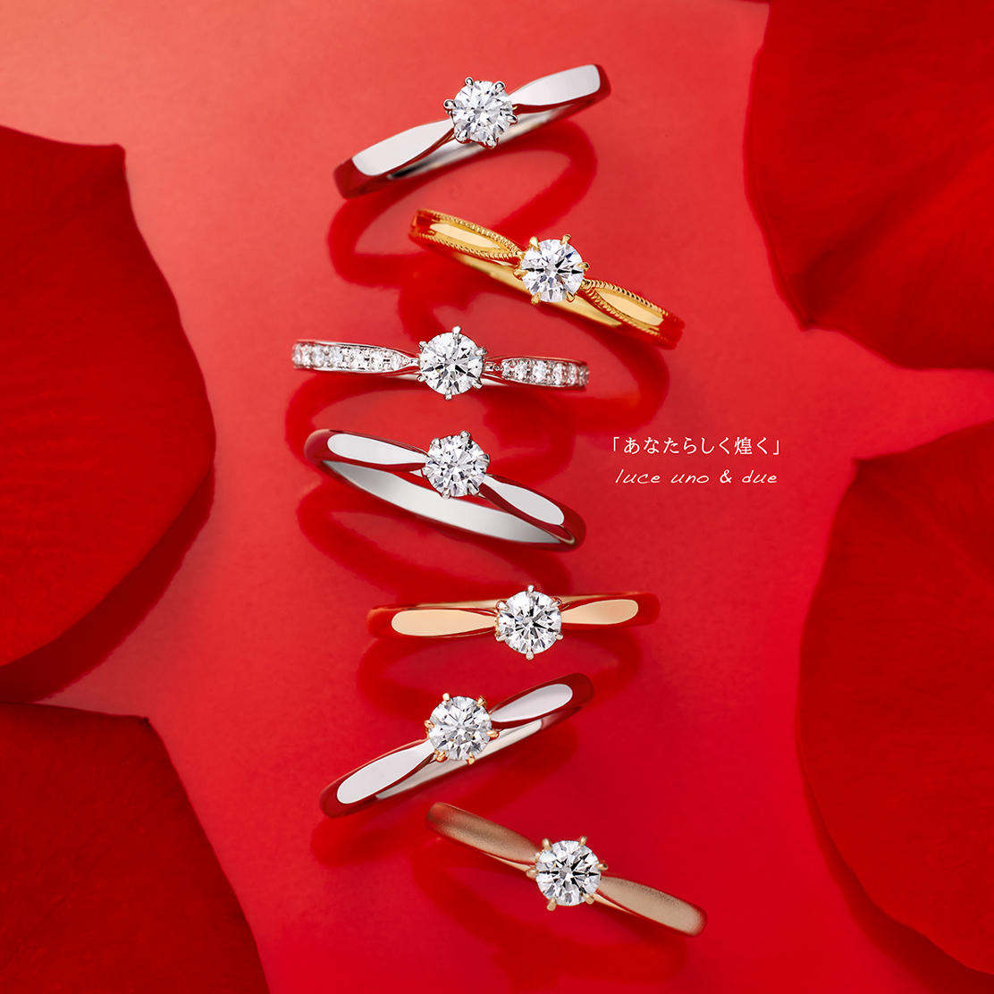 婚約指輪専用のデザインでuno (ウノ)とdue (ドゥーエ)の2型あります。ゆびわ言葉®に込めた想いを50種類以上の組み合わせからなる自由性の高い造りで表現できることが最大の特徴です。